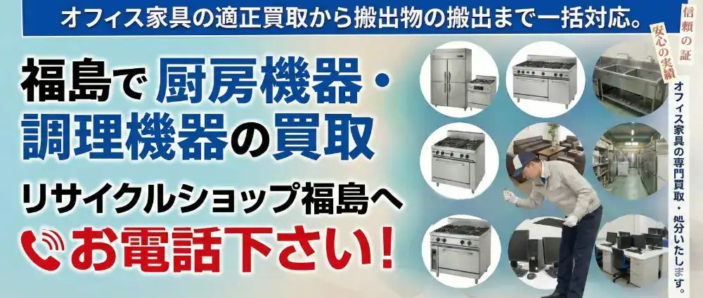 居抜き物件やスケルトン戻しに伴う厨房機器の撤去。“リサイクルショップ福島” なら、買取と処分を同時に行い、コストを削減します。